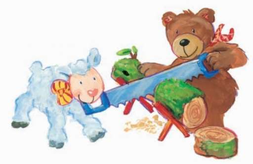 In Bonos Garten kippten sie den Stamm vom Wagen und der Bär holte eine riesige Säge. Sie hatte an jeder Seite einen Griff, so konnten sie gemeinsam sägen.