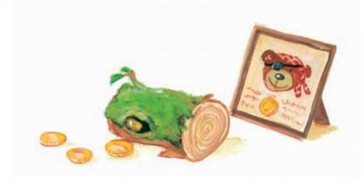 Doch dann … „Es ist noch einer übrig“, sagte Schnuffel. Bono Bär überlegte. Dann hatte er eine Idee. „Ich weiß, was ich damit mache! Ich hänge ihn in einem Rahmen an die Wand. Und dazu erzähle ich jedem die wilde Geschichte, wie wir die Piratentaler fanden. Denn die müssen ja wohl von Piraten sein."
