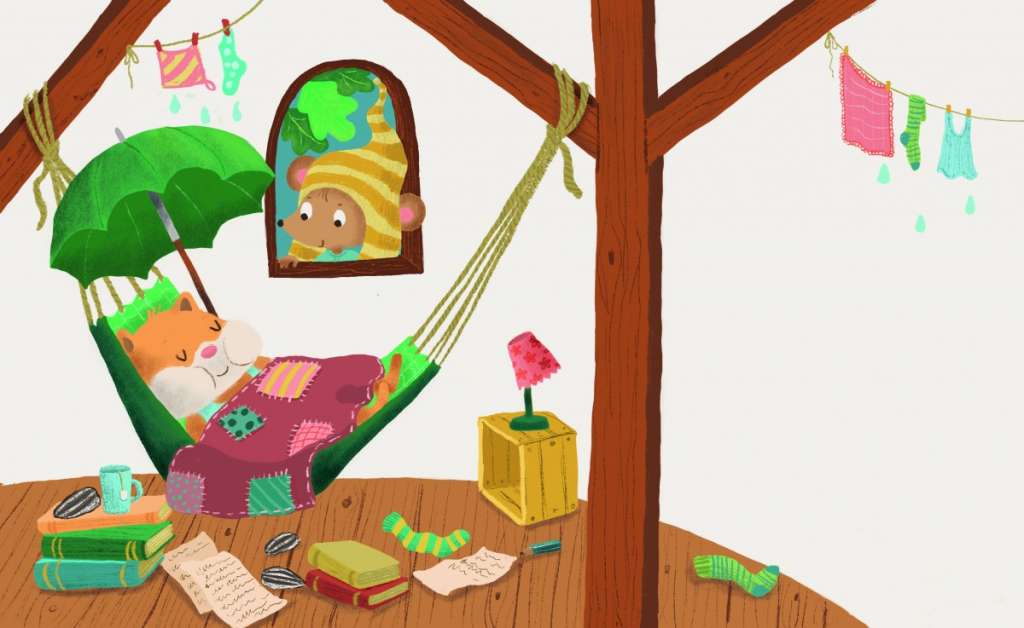 Der Hamster wohnt nebenan. Er liegt in seiner Hängematte und schnarcht.
