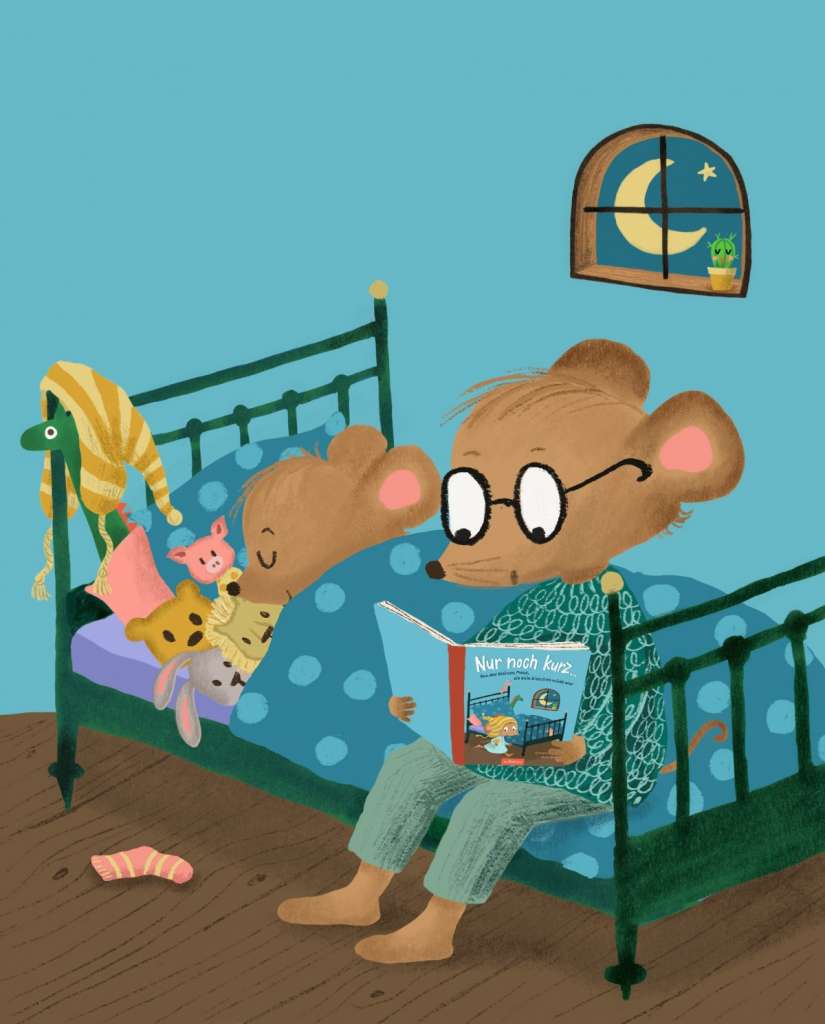 „Also pass auf, die Geschichte geht so: Es war einmal eine kleine Maus, die nicht schlafen gehen wollte. Mama Maus sagte: ‚Es ist schon spät, kleine Maus, du musst ins Bett!’ ‚Noch 10 Minuten!’, rief die kleine Maus. ‚Ich will nur noch ein paar Löcher in den Käse bohren!’ …“