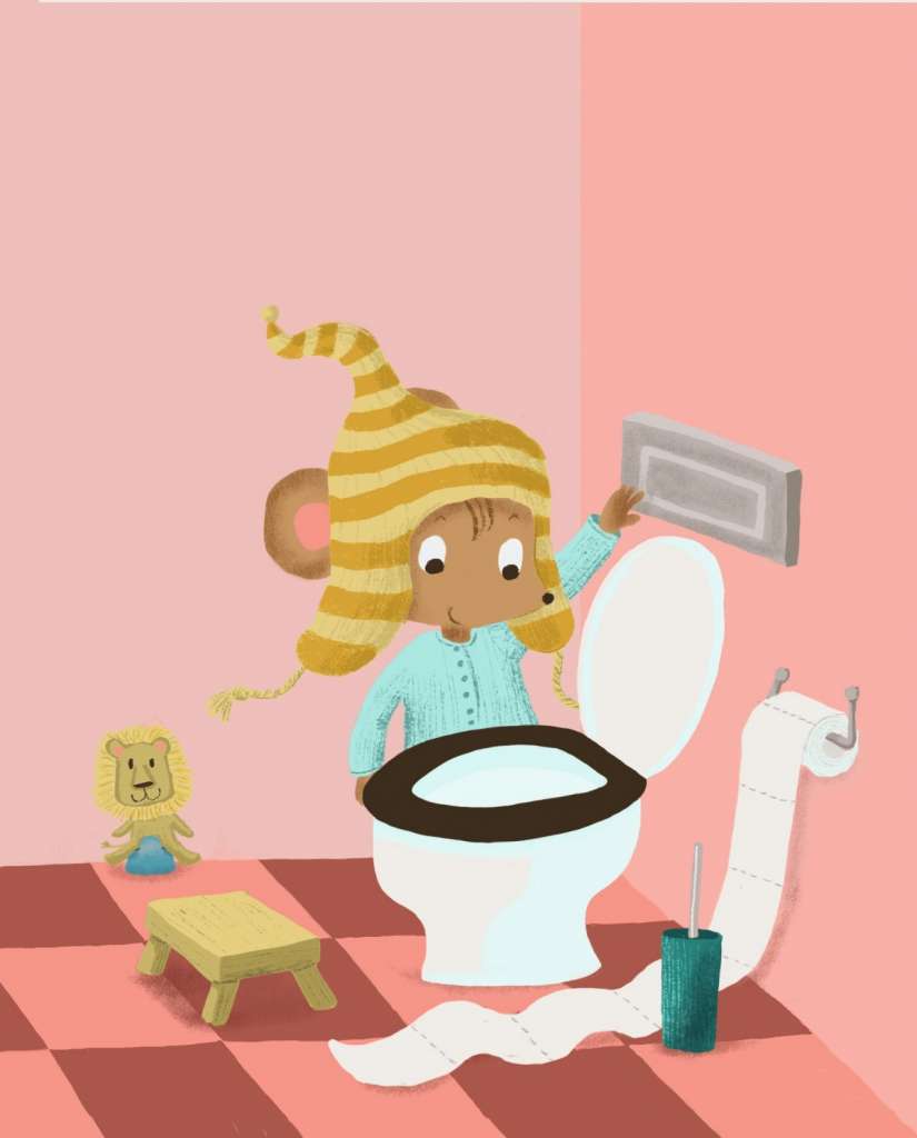 „Jetzt muss ich aufs Klo!“, ruft die kleine Maus. „Ich habe so viel Wasser getrunken.“