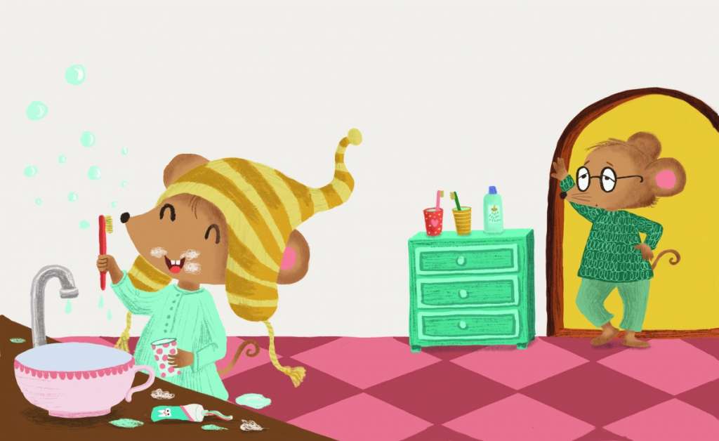 „Nur 3 Minuten“, ruft die kleine Maus. Im Bad schrubbt sie ihre 3 Zähne. Die zwei vorderen und auch den Backenzahn ganz hinten.